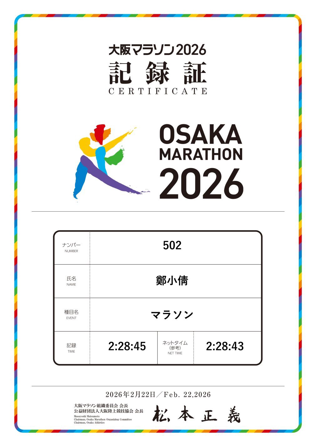 2月22日,马年大年初六,大阪马拉松率先开战,作为中国唯一受邀参赛的女子精英,浙江工业大学体育老师出身的郑小倩跑出2:28:43的净成绩,位列赛会第7名。2:28:43这个成绩也改写了她的全马PB,去年11月她的首马南京马拉松跑出的PB2:29:07就此成为过去。